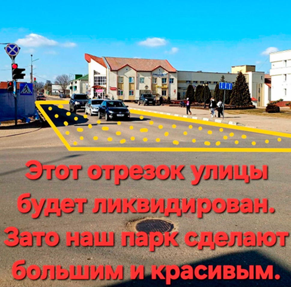 Так, согласно плана, он увеличит размеры. Прежде всего, за счёт ликвидации двух дорожных участков: того, что разрезает его надвое (выходит к библиотеке), и второго, который между ТЦ «Радуга» и светофорами (на фото). Таким образом, в территорию парка войдёт и площадь перед исполкомом. Парк покроют значительным количеством плитки и, будем надеяться, в обновлённом виде он получится очень красивым.