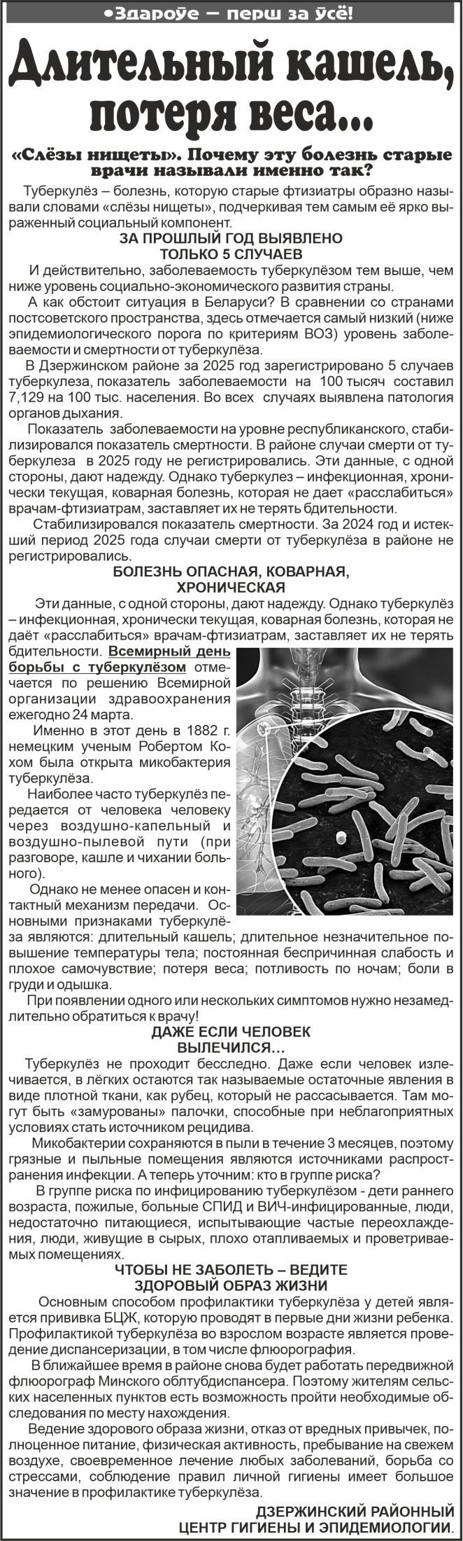 В Дзержинском районе за 2025 год зарегистрировано 5 случаев туберкулеза, показатель заболеваемости на 100 тысяч составил 7,129 на 100 тыс. населения. Во всех случаях выявлена патология органов дыхания.