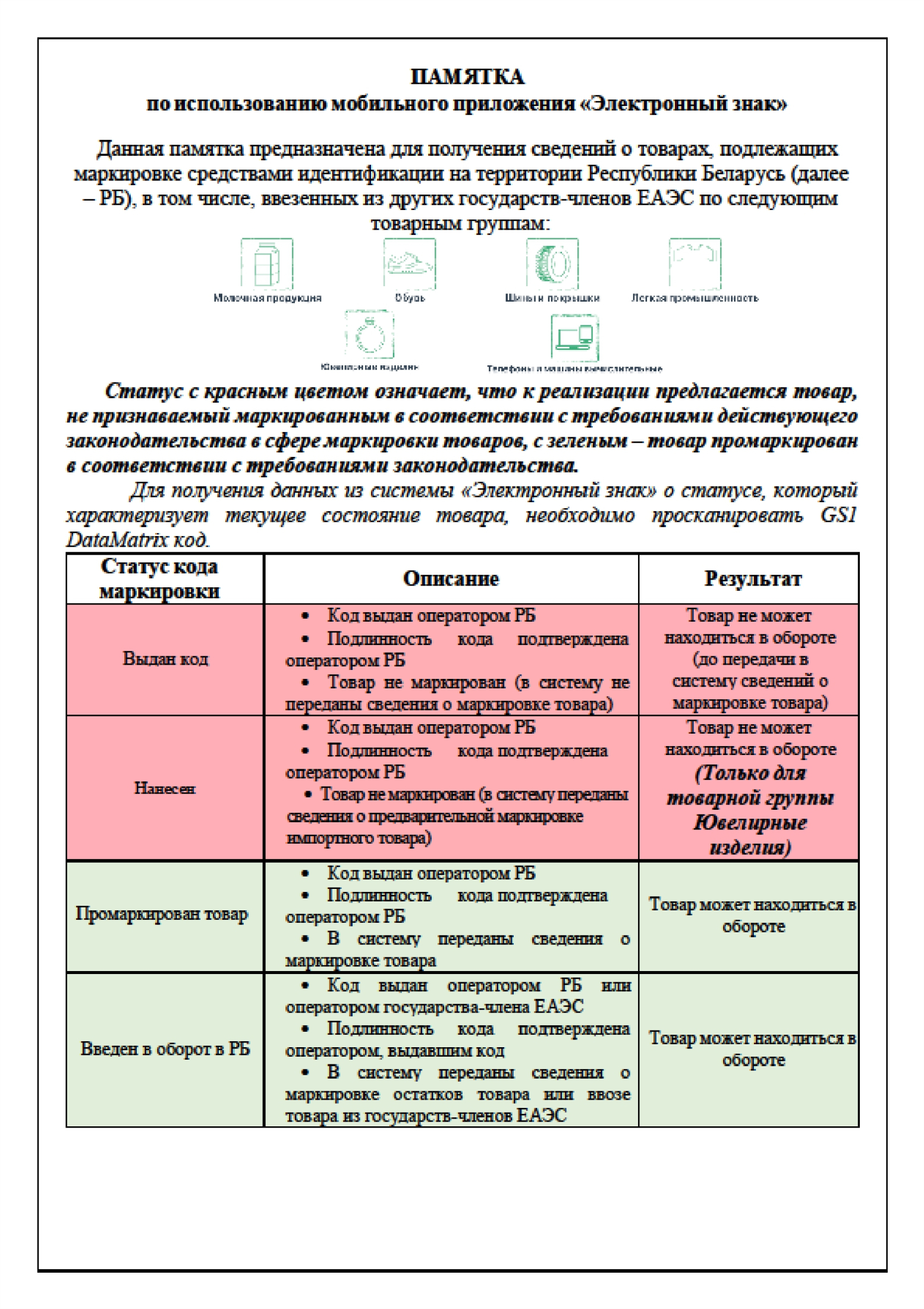 Памятка для получения сведений о товарах, подлежащих маркировке средствами идентификации на территории РБ