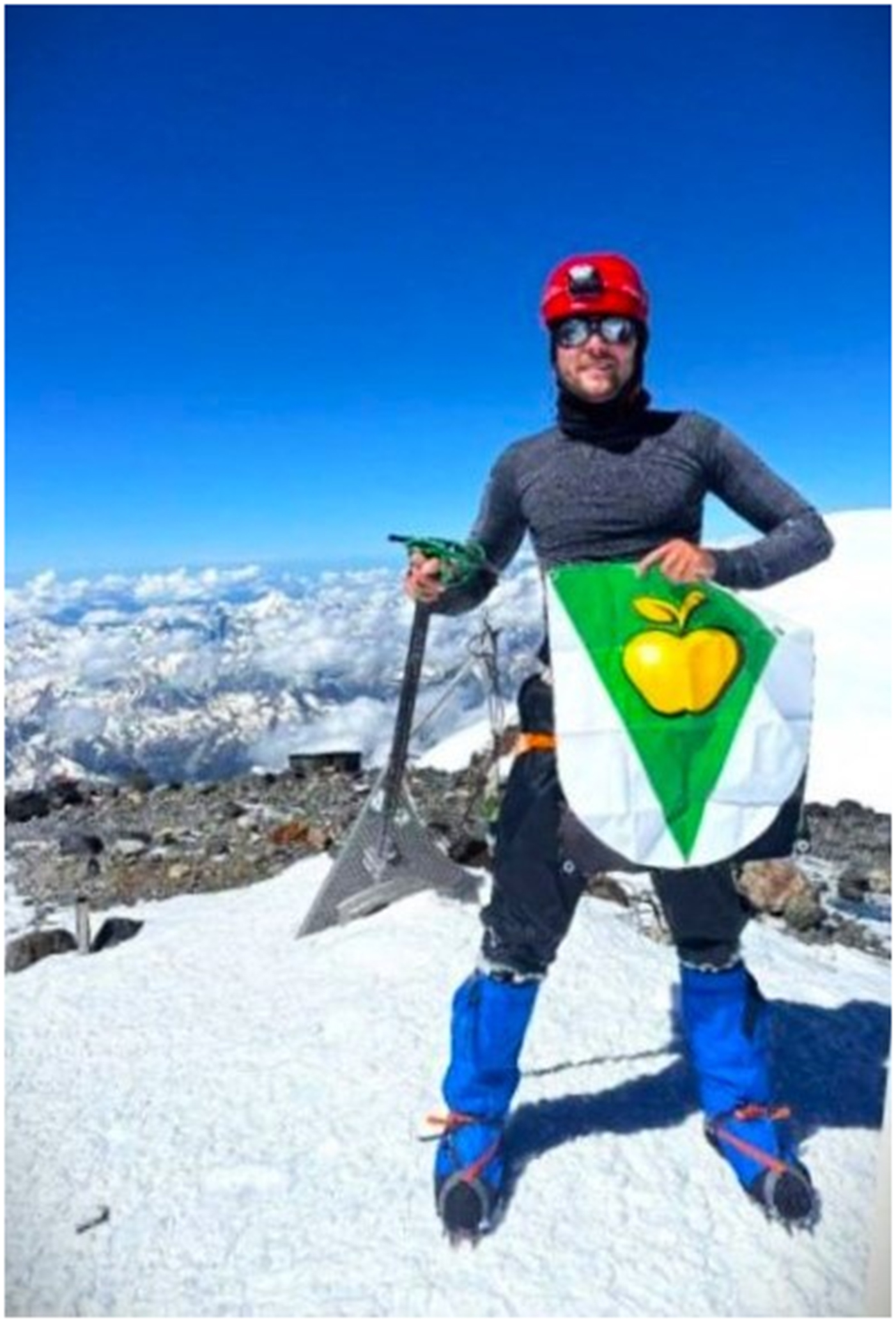 Напомним, что в предыдущий раз Евгений совершил восхождение на Эльбрус — в канун 3 Июля. Фото на память также было сделано с гербом Фаниполя.