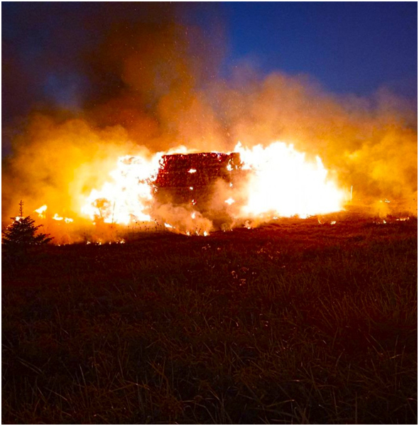 Уничтожено 18 тюков соломы урожая этого года. Они были выложены в виде декоративной композиции, символизирующей окончание жатвы. Композиция принадлежала филиалу «Пятигорье» ОАО «Агрокомбинат «Дзержинский».